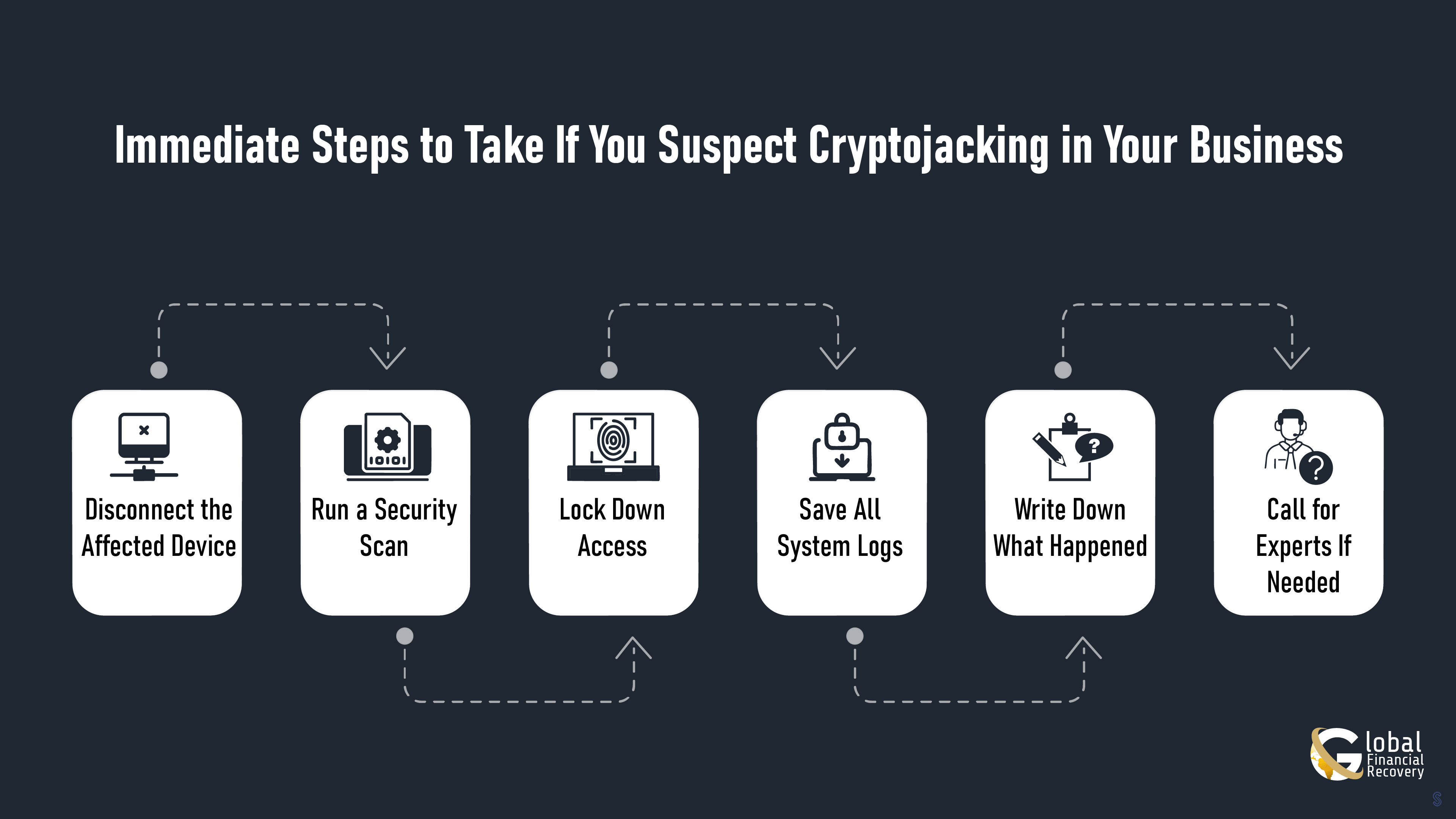 Learn the essential actions to take when cryptojacking is suspected disconnect devices, run scans, secure access, save logs, and call experts if needed.