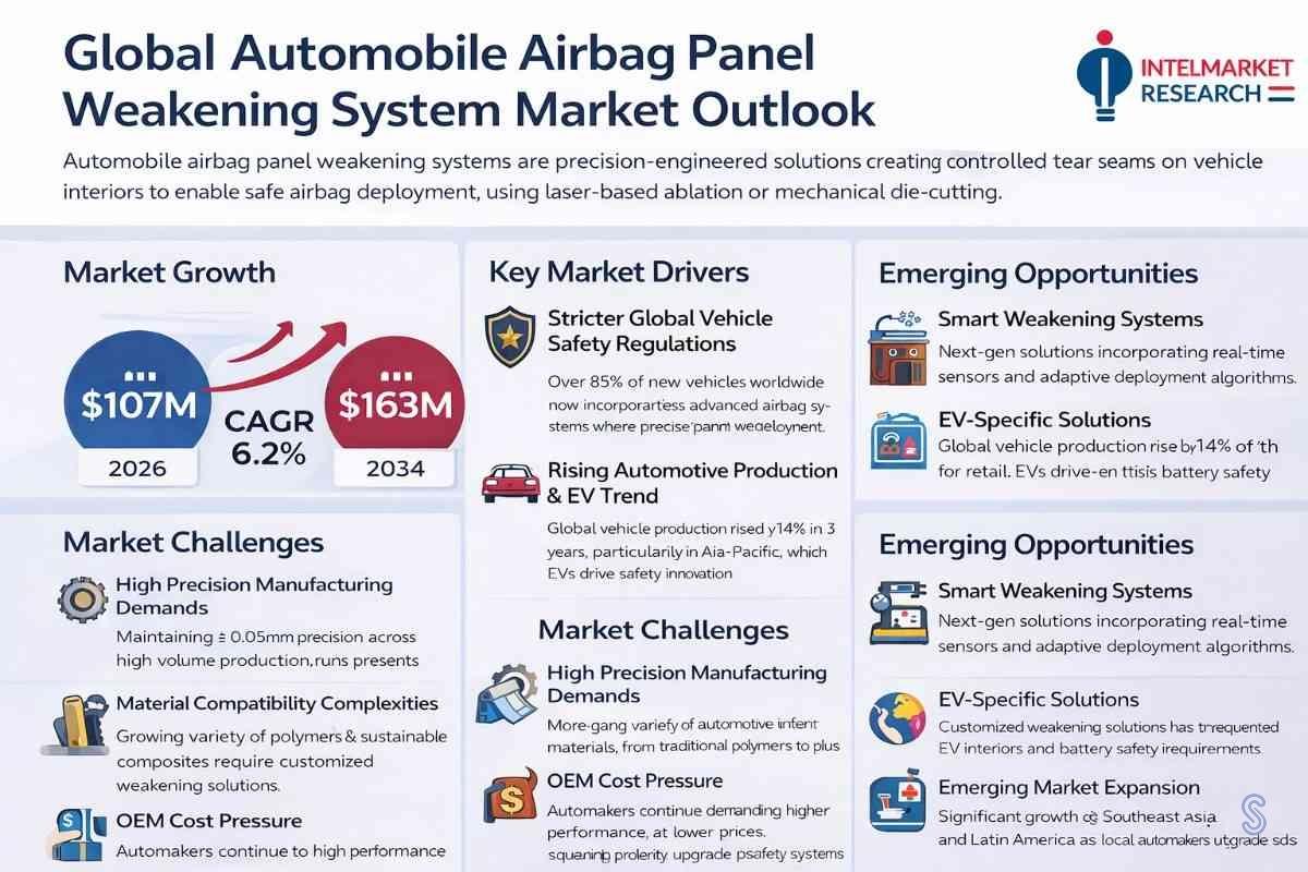 According to a new report from Intel Market Research,Global Automobile Airbag Panel Weakening System market was valued at USD 107 million in 2026 and is projected to reach USD 163 million by 2034, growing at a steady CAGR of 6.2% during the forecast period (2026-2034). This growth is driven by rising automotive safety standards, increasing vehicle production volumes, and continuous advancements in laser processing technologies.