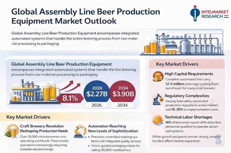 Global Assembly Line Beer Production Equipment Market Projected to Reach USD 3.90 Billion by 2034, Growing at a CAGR of 8.1% – Key Players and Trends According to new market analysis from Intel Market Research, Global Assembly Line Beer Production Equipment market was valued at USD 2.27 billion in 2026 and is projected to grow at a CAGR of 8.1%, reaching USD 3.90 billion by 2034. This significant growth reflects the brewing industry's rapid modernization and the global demand for more efficient beer production systems. What is Assembly Line Beer Production Equipment? Assembly line beer production equipment comprises integrated automated systems that handle the entire brewing process from raw material processing to packaging. These advanced systems combine mashing equipment, fermentation tanks, filtration units, and filling/packaging lines into seamless production flows. By implementing these solutions, breweries achieve higher output consistency while reducing labor costs and production time - crucial factors in today's competitive beverage market. 📥 Download FREE Sample Report: https://www.intelmarketresearch.com/download-free-sample/30472/assembly-line-beer-equipment-market